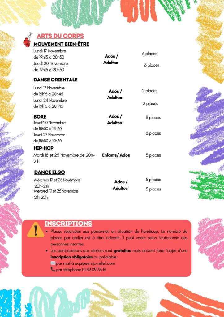 - Informations et inscriptions : par mail à equipe@mjc-relief.com ou par téléphone au 01 69 09 33 16