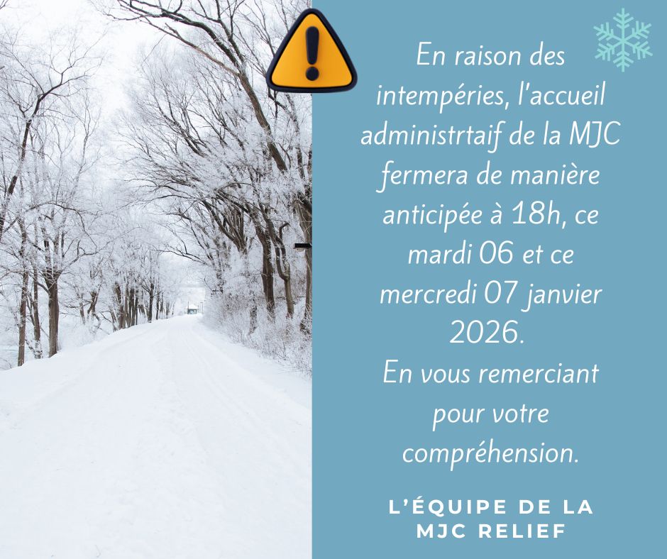 En raison des intempéries, l’accueil administrtaif de la MJC fermera de manière anticipée à 18h, ce mardi 06 et ce mercredi 07 janvier 2026. Les ateliers de pratiques culturelles et[…]