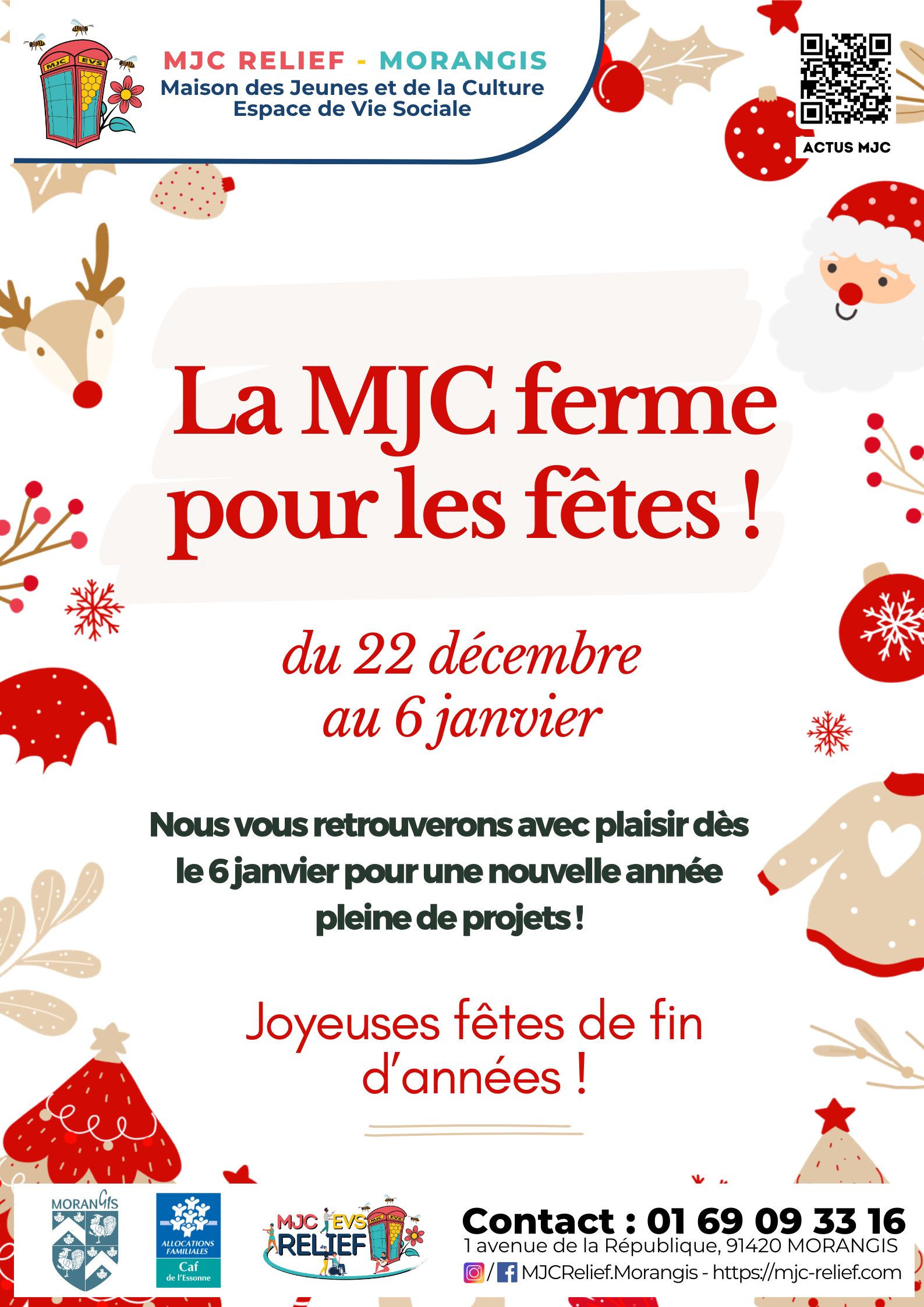 La MJC fermera ses portes du lundi 22 décembre au mardi 6 janvier 2025. L’ensemble des ateliers s’arrête ainsi que l’accueil administratif. Toute l’équipe de l’association espère que vous passerez d’agréables fêtes de fin d’année et que vous pourrez profiter de temps de repos pour clôturer 2025 en beauté ! ❄️