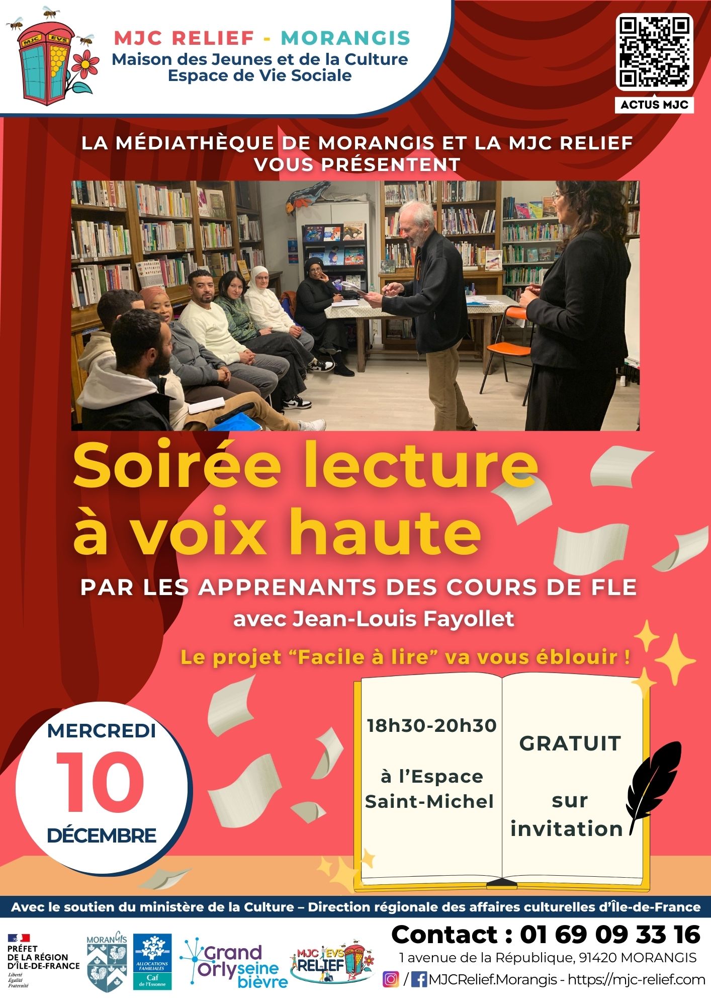 En partenariat avec la médiathèque de Morangis 📚 et le comédien Jean-Louis Fayollet, les apprenant·e·s des ateliers de Français Langue Étrangère de la MJC travaillent la lecture à voix haute durant les mois de novembre et décembre ! La restitution de ces séances se fera sous la forme d’un petit spectacle, lors de la soirée du mercredi 10 décembre🎇.